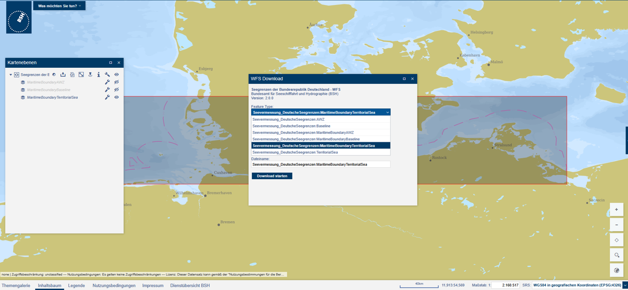Once there, click on Was mochsten Sie tun? then Inhaltsbaum on the bottom, and in Kartenebenen, click on the tool sign, and then in the download sign. When it ask WFS download, you can choose shapefile for example. Download Seevermessung_DeutscheSeegrenzen:MaritimeBoundaryTerritorialSea and Seevermessung_DeutscheSeegrenzen:AWZ.