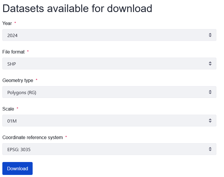GISCO (Geographical Information System of the COmmission) is the European Commission’s system for geographic data, providing standardized maps, administrative boundaries, and spatial datasets for all EU countries and regions, mainly to support statistics, policy-making, and geographic analysis. Link to GISCO.
