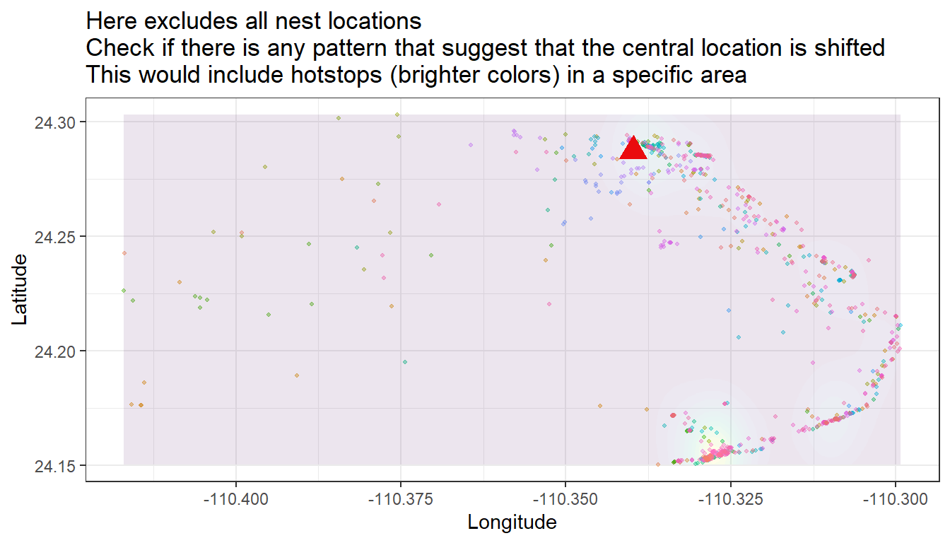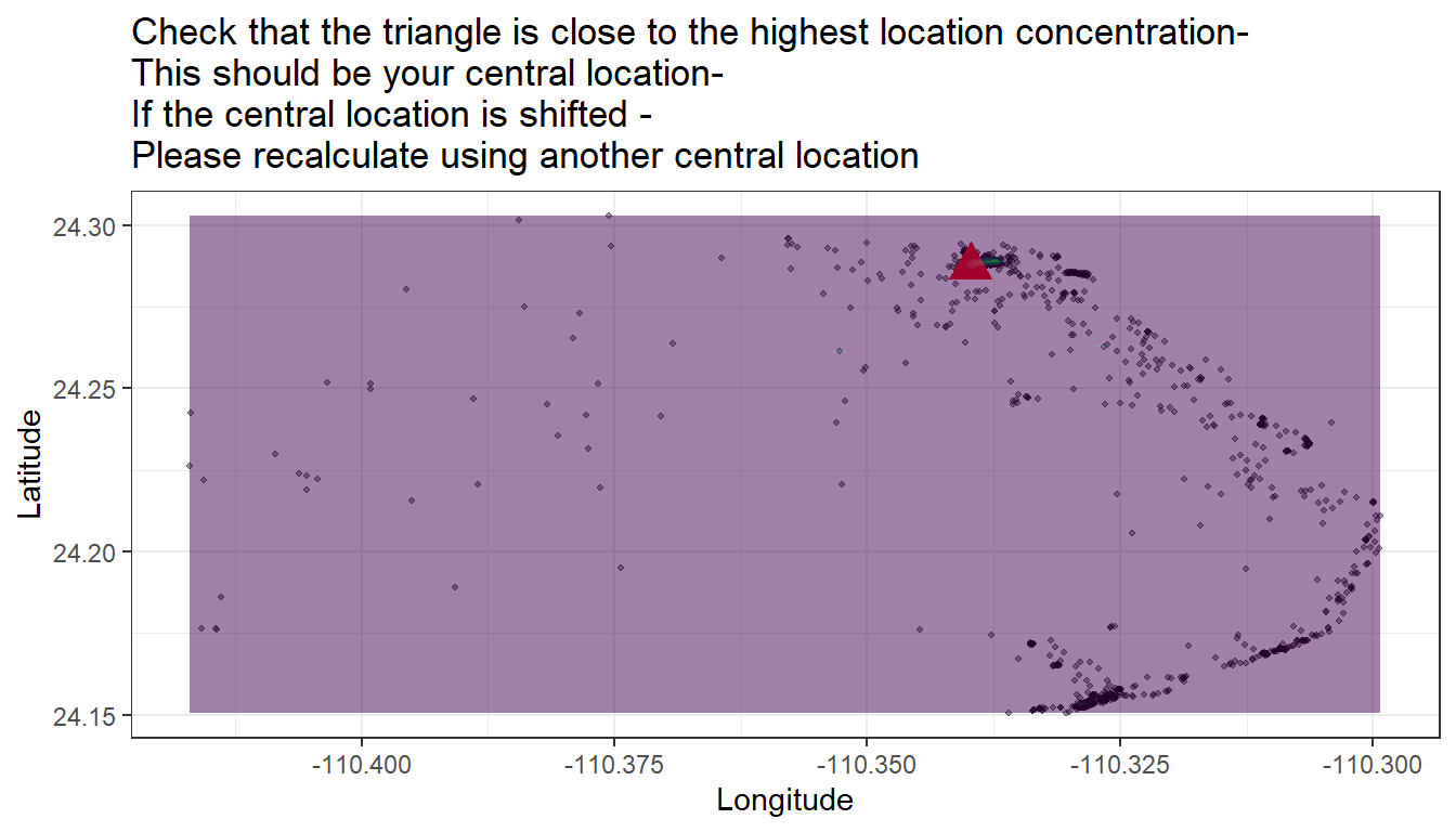 filter(month==This_month)nest_central_location<-data.frame(Longitude=-110.33979846296234,Latitude=24.28728834326802)plot_check(my_locs=Trips_01locs,my_central_location=nest_central_location)